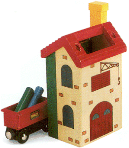 Load through the roof. Press chimney to release the magnetic cargo into the wagon. Includes wagon, tower and 2 magnetic loads. Height 170 mm/6.75".