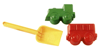 Engine and box car train mold set with shovel. Packaged in net bag.
