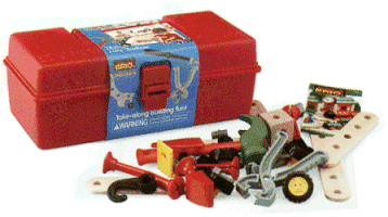 Take-along building fun toolbox set! A great introductory purchase to the BRIO Builder System. Includes 4 tools and assorted play pieces. Toolbox color may vary.