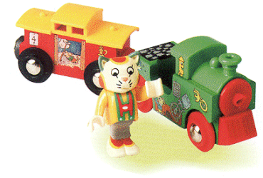 Three Play Pieces! Bright engine and caboose with magnetic couplings. Complete with Huckle the Cat as Engineer.