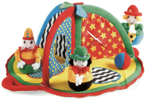 Portable play environment for take-along fun! This festive pop-up tent creates an instant playscape. Peek-a-boo doorways, three bright roly-poly clowns and rattle ball. Large easy grip zipper. Surface wash only.